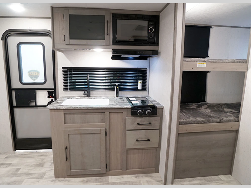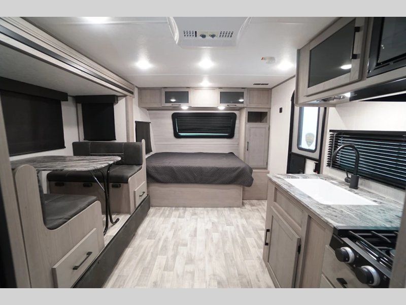 The hybrid aluminum steps give you stability as you enter and exit the unit and are easy to expand or store away when you are traveling. With a standard 13,500 BTU A/C unit, you will stay cool even on the hottest summer days, and the on-demand tankless water heater will provide endless hot showers. You will love the look of the seamless countertops and the Home Series interior collection decor, and there is HyperDeck flooring that is durable and easy to keep clean!