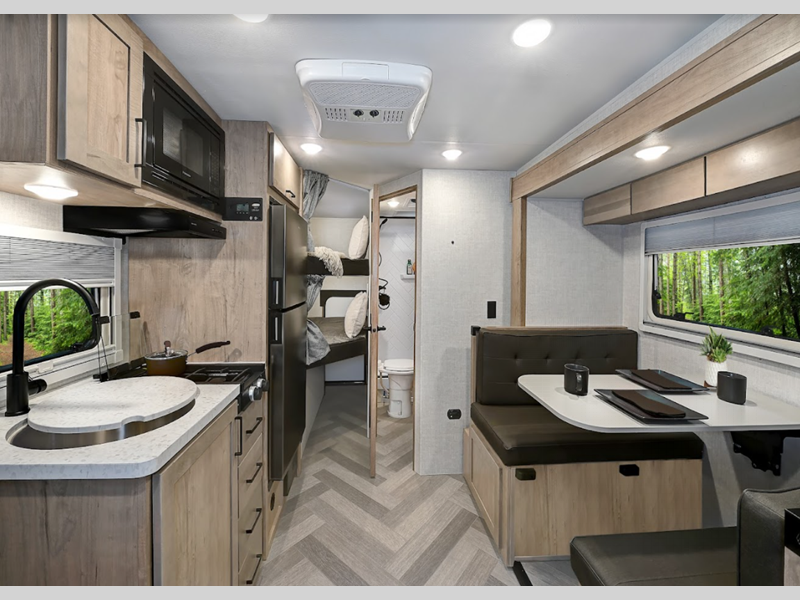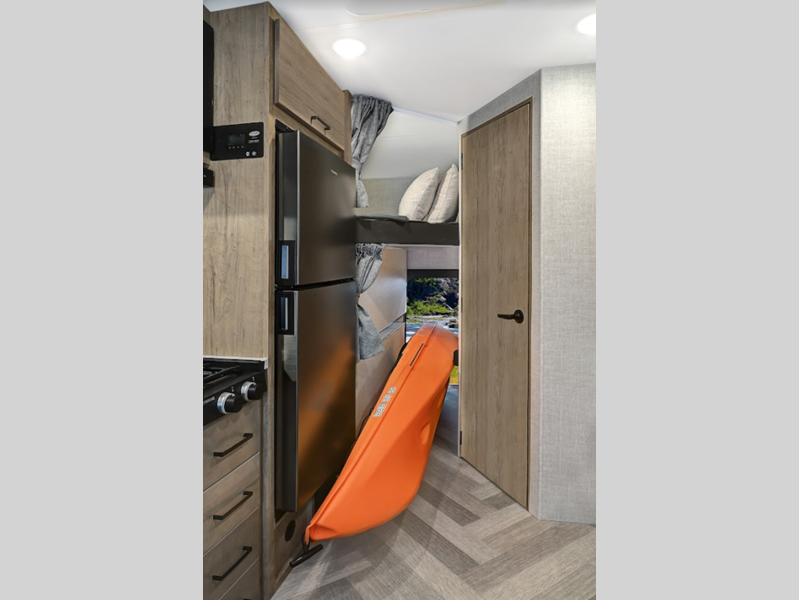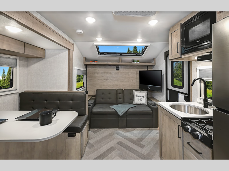 Sleeps 3 Slides 1 Length 24 ft 1 in Ext Width 8 ft Ext Height 10 ft 9 in Hitch Weight 585 lbs GVWR 7250 lbs Dry Weight 5460 lbs Cargo Capacity 1790 lbs Fresh Water Capacity 55 gals Grey Water Capacity 35 gals Black Water Capacity 35 gals Tire Size 16" Available Beds Queen Refrigerator Type 12V Convection Cooking Yes Cooktop Burners 2 Shower Size 32" Number of Awnings 1 LP Tank Capacity 20 lbs Water Heater Type Truma Combi Comfort Plus AC BTU 18000 btu TV Info LR 12V LED HDTV Awning Info 16' Electric w/ Dimmable Light Axle Count 2 Number of LP Tanks 2 Shower Type Radius Electrical Service 30 amp Similar Floorplans