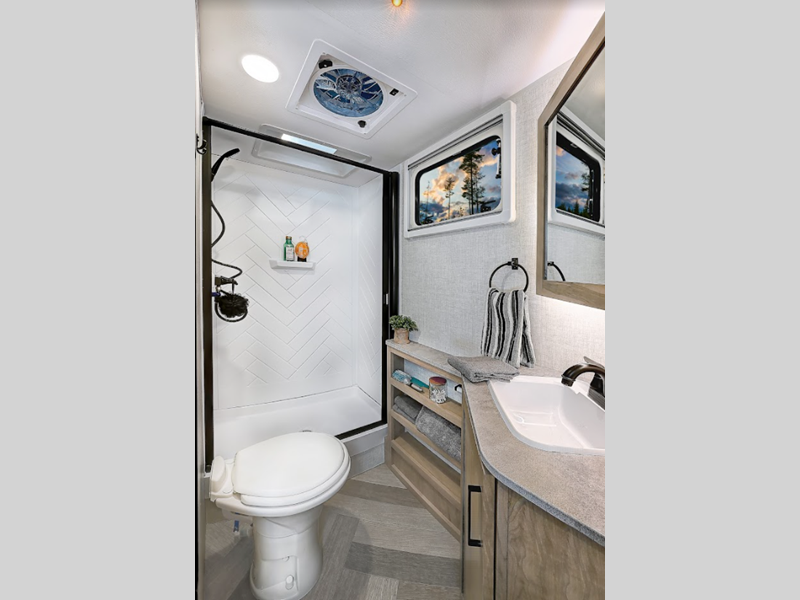 Each model comes with hardwood framed cabinet doors, seamless countertops, and a stunning "Stargazer" European dual pane acrylic skylight to bring the outdoors inside. The Off-Grid Solar package has you covered with dual Go Power! 200W solar panels and a 2000W inverter, or you can choose the optional Max Solar Package for even more off-grid capabilities! You will love how easy it will be to tow your RV with the CURT independent suspension, and there are single and tandem axle models to choose from, depending on your needs.
