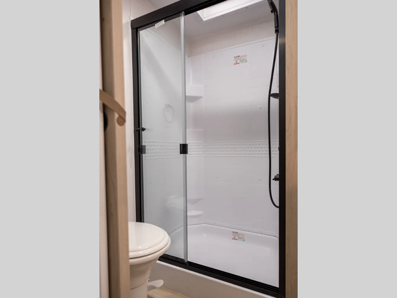Outside, you'll find a power awning with an adjustable rain dump and LED lighting, backup camera pre, Keyed Alike locks, plus many more conveniences. The enclosed underbelly will help extend your camping season, and you can enjoy your RV for years thanks to the durable construction materials, like the radiant foil insulation and 5/8" plywood tongue and groove subfloor. Each fifth wheel and travel trailer also includes lino flooring in all slides, aluminum dinette, bed and bunk, plus solid surface kitchen countertops.