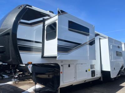 Sleeps 4 Slides 4 Length 42 ft 6 in Ext Width 8 ft 6 in Ext Height 13 ft 3 in Int Height 8 ft 6 in Interior Color Stonewall Gray Exterior Color Opt. Full Body Paint (Ash, Shadow, Glacier Blue) Hitch Weight 2970 lbs GVWR 17995 lbs Dry Weight 15275 lbs Cargo Capacity 2720 lbs Fresh Water Capacity 75 gals Grey Water Capacity 137 gals Black Water Capacity 50 gals Tire Size 215/75R17.5H Furnace BTU 40000 btu Available Beds King Refrigerator Type Residential Refrigerator Size 21 cu ft Convection Cooking Yes Cooktop Burners 4 Shower Size 36" x 48" Number of Awnings 2 Axle Weight 8000 lbs LP Tank Capacity 90 Lbs. Water Heater Type On Demand Tankless AC BTU 30000 btu TV Info LR 4K Smart LED HDTV, BR 32" 4K Smart TV Awning Info 15' & 17' Electric w/ Integrated RGB LED Lights Axle Count 2 Washer/Dryer Available Yes Shower Type Walk-In Shower Solar Wattage 400 watts Similar Fifth Wheel Floorplans