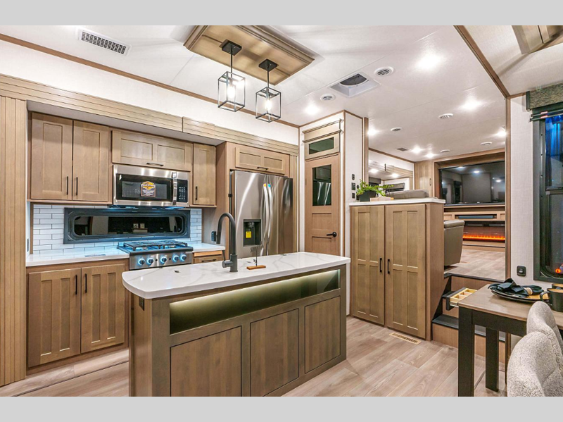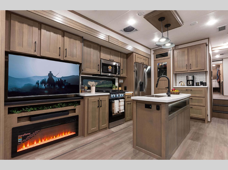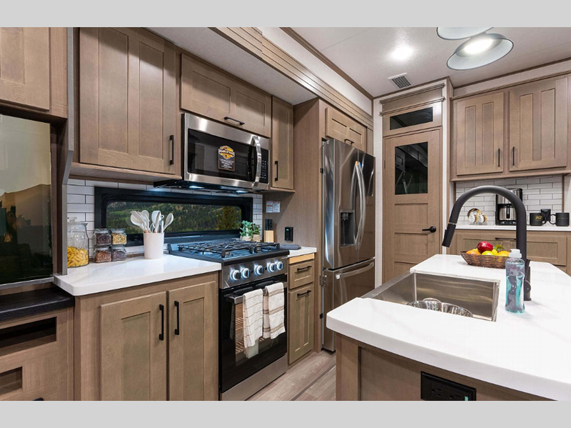 Each fifth wheel is built with 101" wide-body construction, an extra-reinforced heavy-duty front fiberglass cap, and include the All-Weather Insulation Package so you can camp all year around. The six-point hydraulic auto-leveling makes setting up easier, and the KZ Engage Powered by OneControl features an app that you can download to control all of your unit's functions right from your smartphone. The Durango Gold's kitchen is a chef's dream with its 26 cu. ft. house refrigerator with a 2,000W inverter, 30" convection microwave, 24" oven with four-burner range, plus abundant storage!
