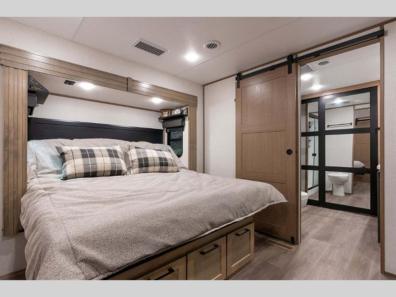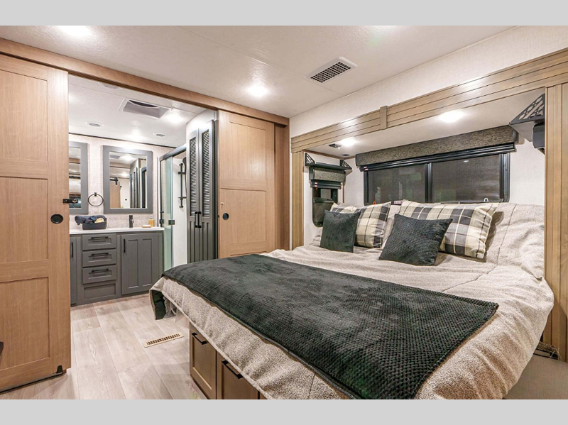 Sleeps 4 Slides 4 Length 34 ft 11 in Ext Width 8 ft 5 in Ext Height 13 ft 6 in Int Height 6 ft 8 in Interior Color Mink, Pebble Exterior Color Black Pearl Full Body Paint Option Hitch Weight 2650 lbs GVWR 14995 lbs Dry Weight 12170 lbs Cargo Capacity 2825 lbs Fresh Water Capacity 76 gals Grey Water Capacity 90 gals Black Water Capacity 50 gals Tire Size 17.5" Furnace BTU 40000 btu Available Beds King Refrigerator Type House Refrigerator with 2000W Inverter Refrigerator Size 26 cu ft Convection Cooking Yes Cooktop Burners 4 Shower Size 48" x 30" Number of Awnings 1 Axle Weight 9520 lbs LP Tank Capacity 30 lbs Water Heater Type On Demand Tankless AC BTU 45000 btu TV Info LR 50" Smart LED TV, BR 32" Smart LED TV Awning Info 17' Electric w/LED Light Strip Axle Count 2 Washer/Dryer Available Yes Number of LP Tanks 2 Shower Type Shower w/Seat Electrical Service 50 amp Similar Floorplans