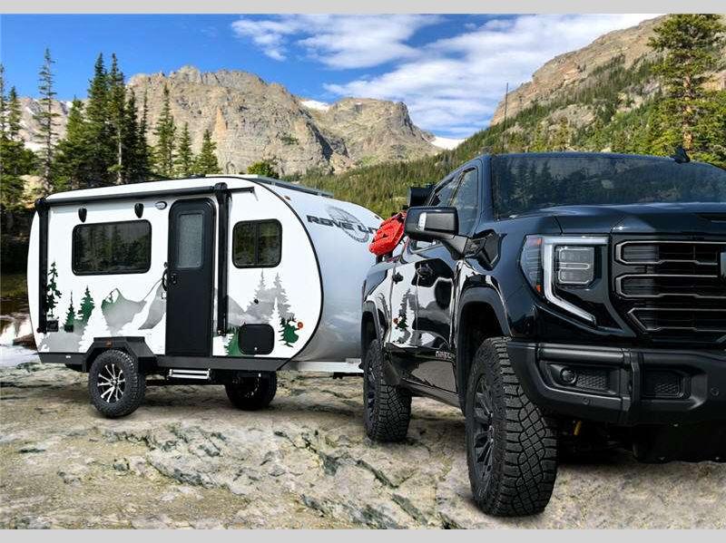 The one piece seamless poured resin fiberglass roof goes from bumper to hitch for a better seal. They offer space-saving functionality with convertible beds and bathrooms with a shower. All Rove Lite models offer solid surface countertops and wood grain cabinetry in the kitchen, a foot flush toilet and fantastic vent, plus 13" custom light-weight aluminum wheels and an outside shower.